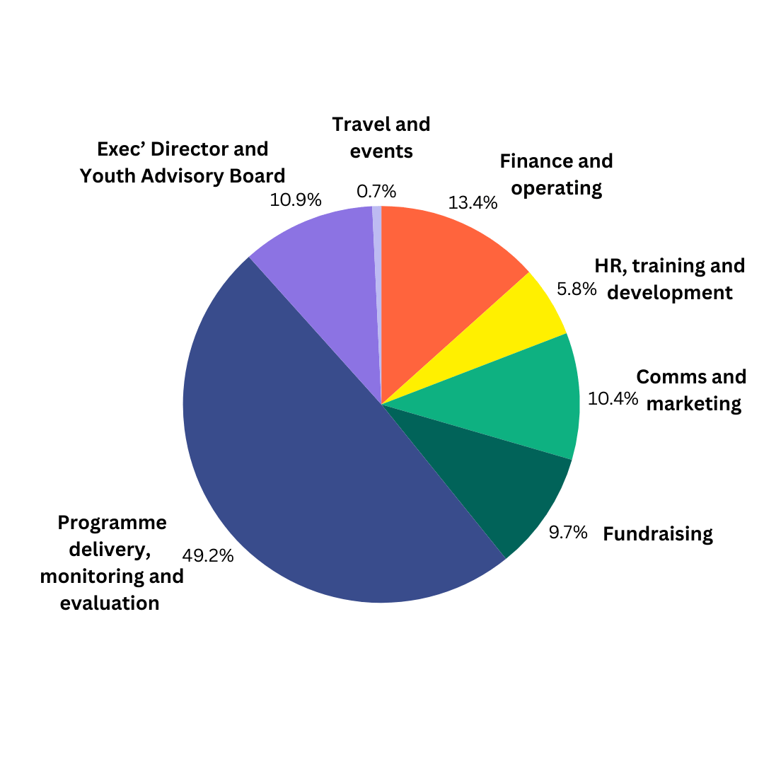 We have a fully remote team, so the majority of our costs are the salaries of eight full-time and one part-time core team members. As a result, a significant proportion of our income is spent on the development and delivery of our programmes for young people, as well as the messaging and outreach we develop to reach them.